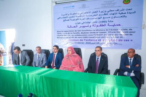 أشرفت معالي وزيرة العمل الاجتماعي والطفولة والأسرة، السيدة صفية انتهاه، رفقة معالي وزير تمكين الشباب والرياضة والخدمة المدنية، السيد محمد عبد الله ولد لولي، ووالي نواكشوط الغربية، السيد حمود ولد امحمد، اليوم الخميس بمباني المدرسة الوطنية للعمل الاجتماعي في نواكشوط، على افتتاح دورة تكوينية لصالح 100 عامل اجتماعي حول حماية الطفولة وتسيير الحالة.